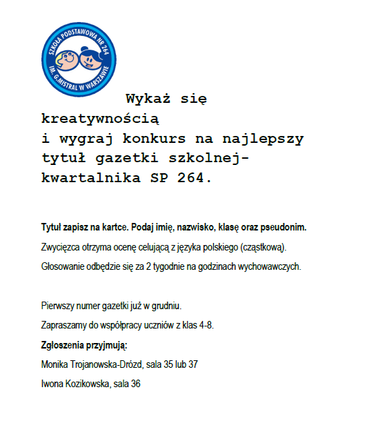KONKURS NA NAJLEPSZY TYTUŁ GAZETKI SZKOLNEJ Zdjęcia Zobacz również ZA LASKIEM PIASEK, A ZA PIASKIEM LASEK- WYCIECZKA... LEKCJA PEŁNA WITAMIN SZKOLNA LIGA JĘZYKA POLSKIEGO KONKURS NA NAJLEPSZY TYTUŁ GAZETKI SZKOLNEJ PODZIĘKOWANIE ZA FESTYN CHARYTATYWNY MAŁY MISTRZ 05 października 2024 Aktualności Wydrukuj Udostępnij Wyświetlono: 139