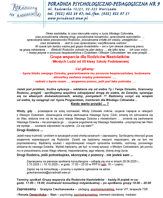 PORADNIA PSYCHOLOGICZNO-PEDAGOGICZNA NR 9 ZAPRASZA Zdjęcia Zobacz również WYBORY DO SAMORZĄDU KLASOWEGO 2A APEL Z OKAZJI ŚWIATOWEGO DNIA PIERWSZEJ POMOCY AKADEMIA MEDIACJI I WOLONTARIATU - ZEGRZE 2025 PORADNIA PSYCHOLOGICZNO-PEDAGOGICZNA NR 9 ZAPRASZA... WCIESOWA OFERTA DLA RODZICÓW SZKOLNY BIEG PO ZDROWIE 2025 17 września 2025 Aktualności Wydrukuj Udostępnij Wyświetlono: 12