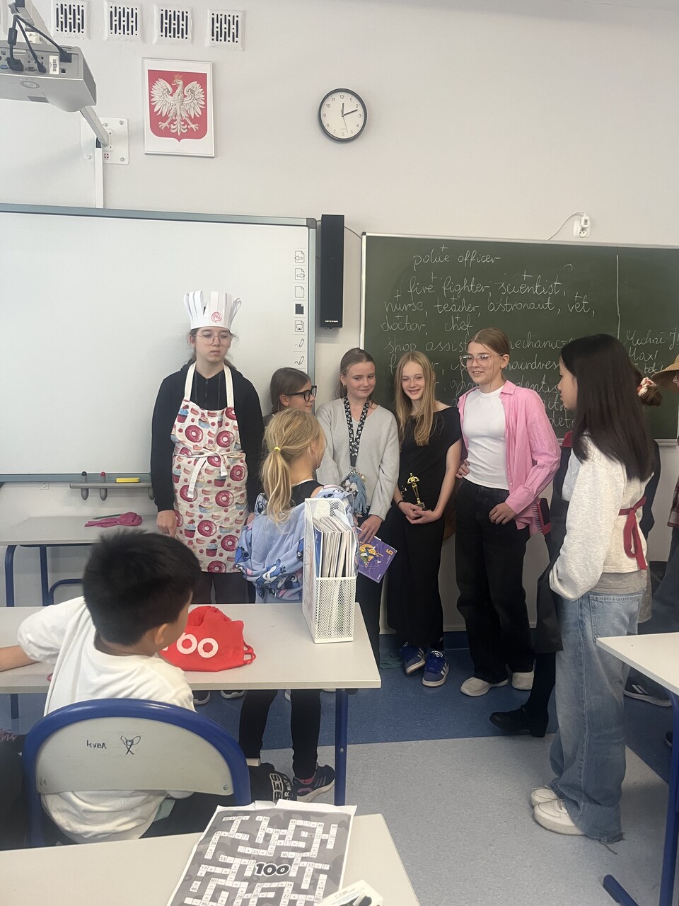 Uczniowie przebrali się za przedstawicieli wybranych profesji. W klasie można więc było zobaczyć lekarzy ze stetoskopami, policjantów w czapkach, artystów z pędzlami, kucharzy, sportowców, naukowców i architektów. Dzięki temu lekcja była bardzo kolorowa, wesoła i pełna energii. Uczniowie opowiadali o wymaganych umiejętnościach, obowiązkach oraz zaletach i wadach pracy w danym zawodzie. Następnie uczniowie klasy 6a i 6b odwiedzili młodsze klasy, aby zaprezentować swoje zawody i opowiedzieć po angielsku o tym, kim chcieliby zostać w przyszłości. Młodsi uczniowie słuchali z zaciekawieniem, zadawali pytania i uczyli się nowych słów po angielsku.