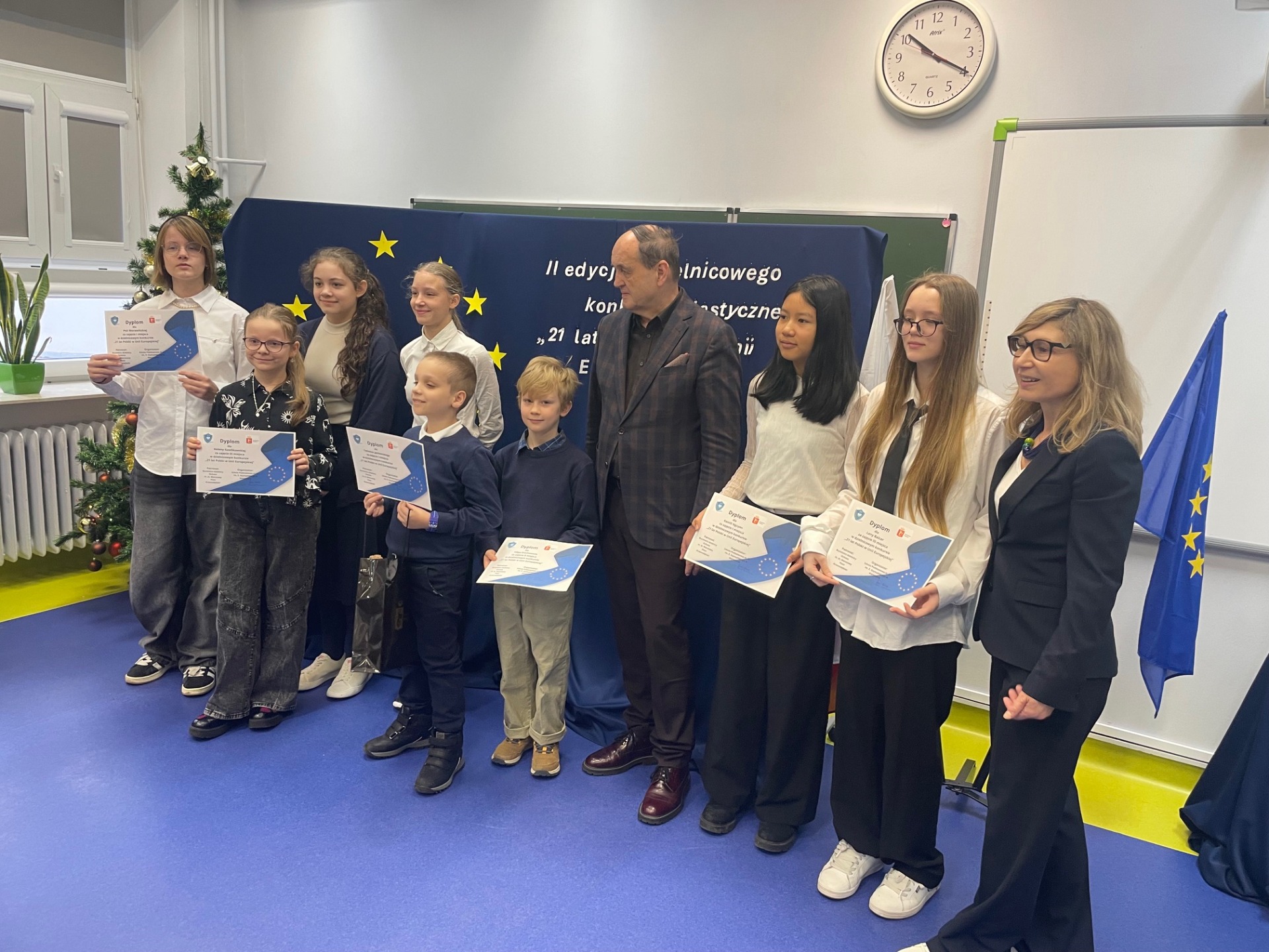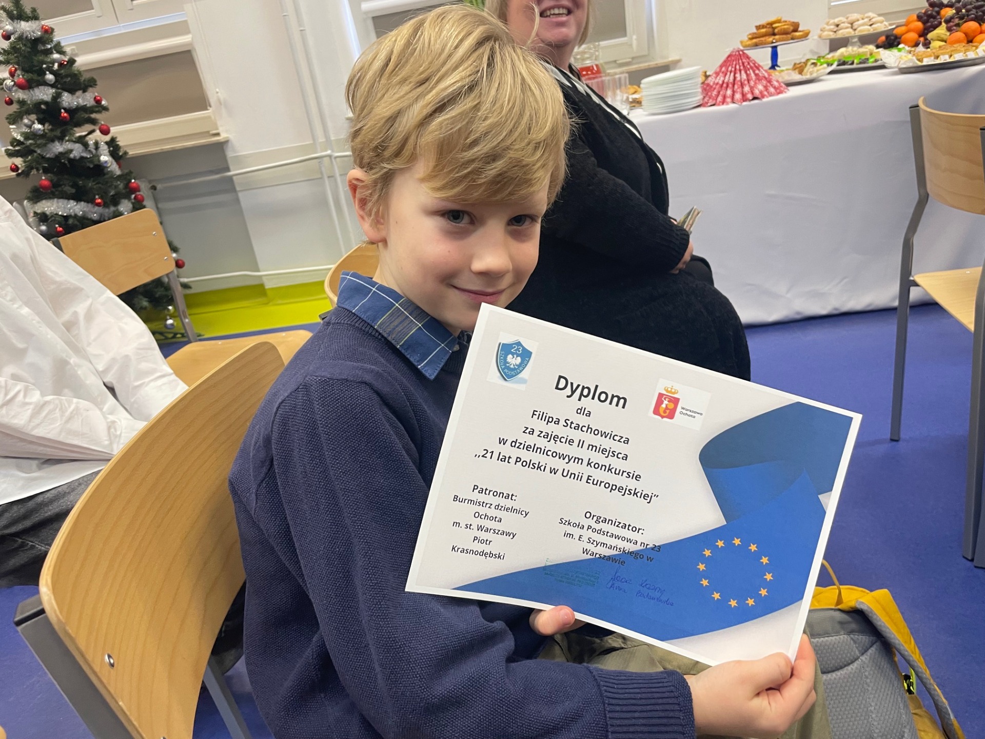 Nasz uczeń klasy 1c Filip Stachowicz zdobył 2 miejsce w konkursie plastycznym '21 lecie Polski w Unii Europejskiej' pod patronatem Burmistrza Dzielnicy Ochota.