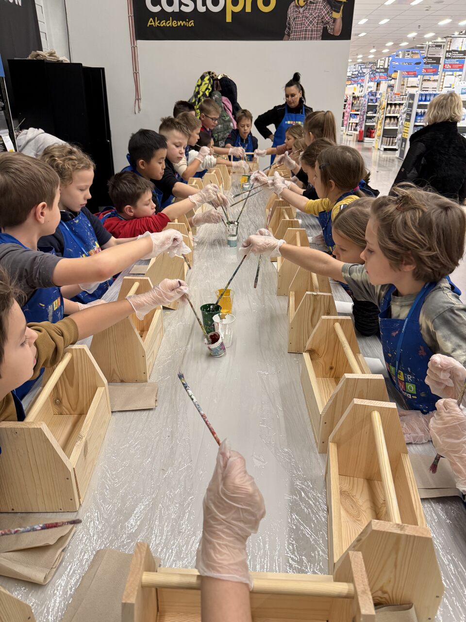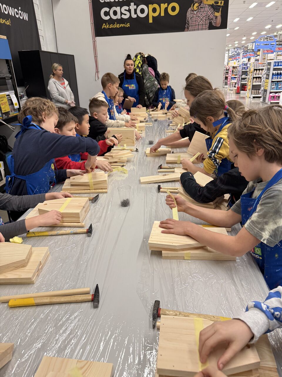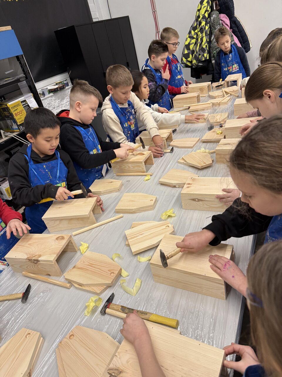 Dnia 18 grudnia uczniowie klasy 2a wybrali się do sklepu Castorama na warsztaty w ramach programu Majsterkowo. Podczas zajęć dzieci samodzielnie zbijały drewniane skrzyneczki, a następnie malowały je według własnych pomysłów. Fantazja nie zawiodła – każda praca była inna i wyjątkowa. Po warsztatach uczniowie zwiedzali sklep. Największe wrażenie zrobiła na nich część z pięknymi dekoracjami świątecznymi. Dużo radości wzbudził także dział z traktorkami do koszenia trawy – dzieci mogły nawet na nie wsiąść i poczuć się jak prawdziwi kierowcy. To był twórczy i udany dzień!