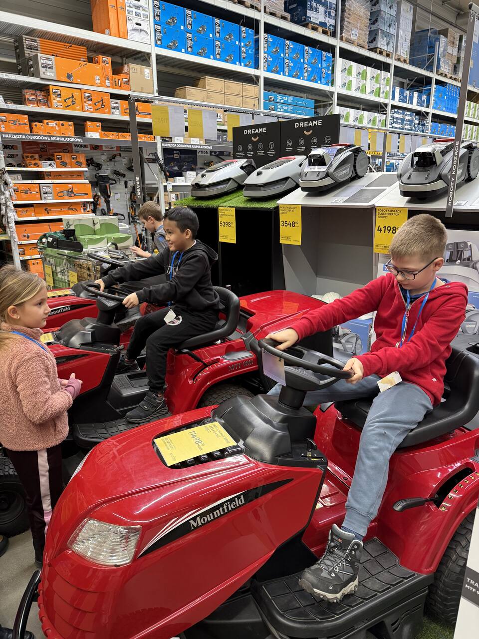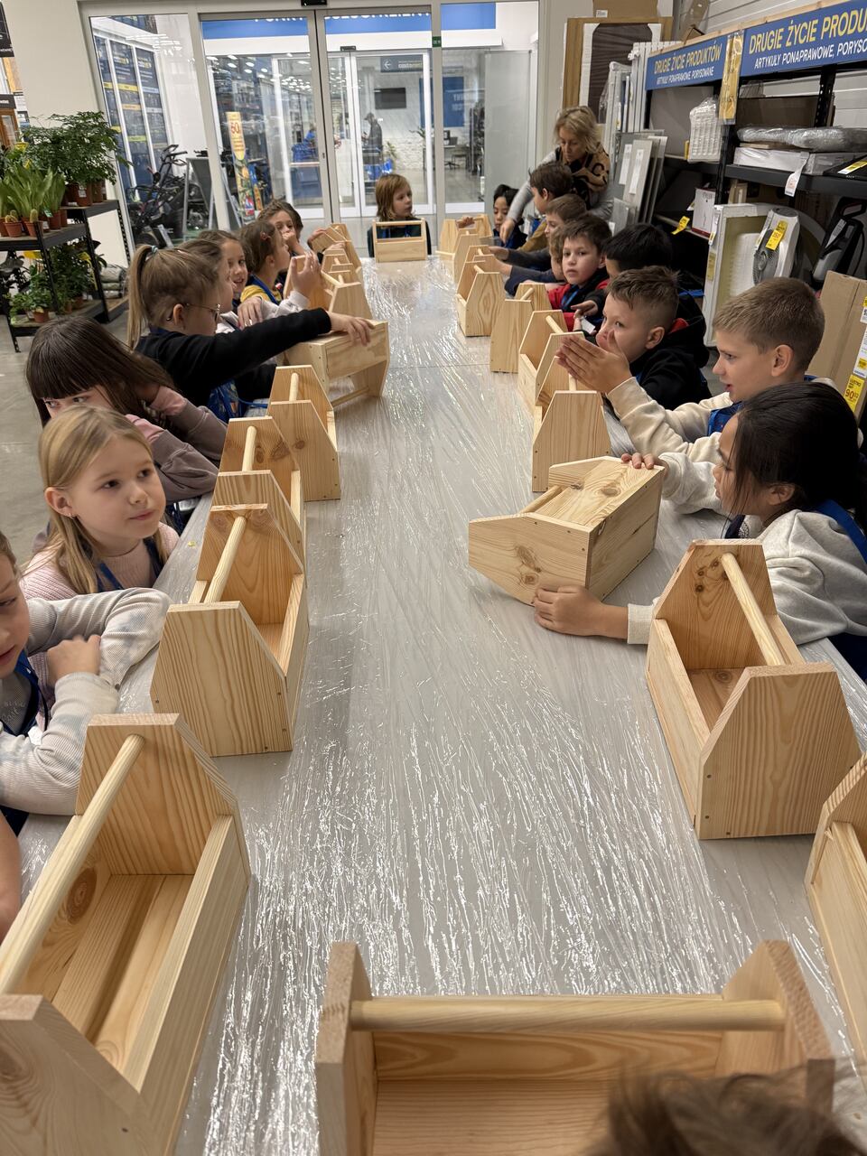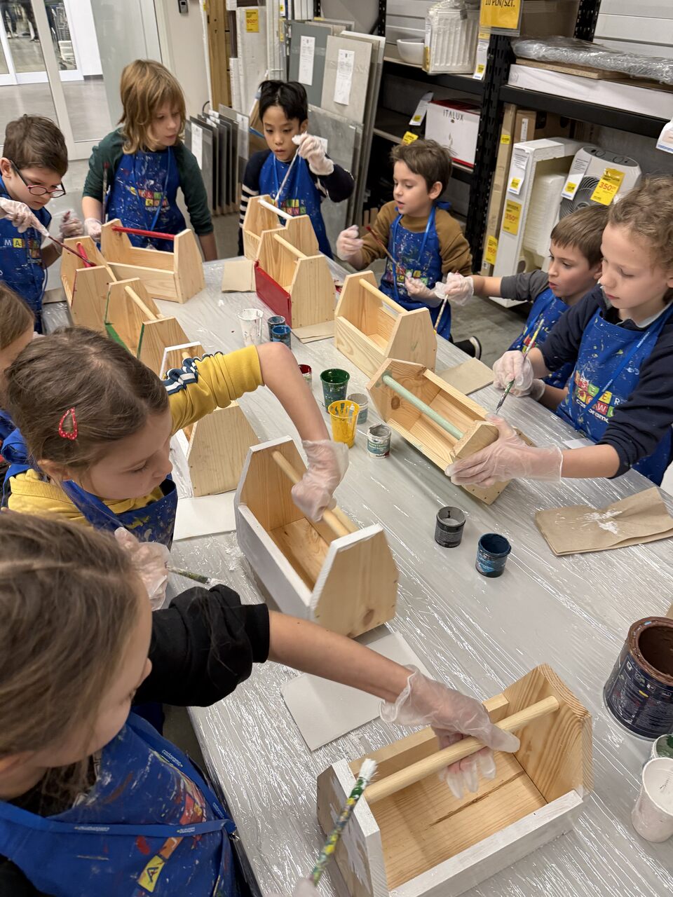 Dnia 18 grudnia uczniowie klasy 2a wybrali się do sklepu Castorama na warsztaty w ramach programu Majsterkowo. Podczas zajęć dzieci samodzielnie zbijały drewniane skrzyneczki, a następnie malowały je według własnych pomysłów. Fantazja nie zawiodła – każda praca była inna i wyjątkowa. Po warsztatach uczniowie zwiedzali sklep. Największe wrażenie zrobiła na nich część z pięknymi dekoracjami świątecznymi. Dużo radości wzbudził także dział z traktorkami do koszenia trawy – dzieci mogły nawet na nie wsiąść i poczuć się jak prawdziwi kierowcy. To był twórczy i udany dzień!