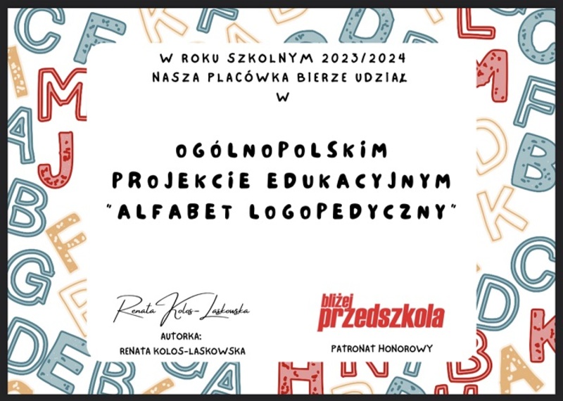 05 września 2023 Aktualności ALFABET LOGOPEDYCZNY W tym roku szkolnym wybrane grupy zajęciowe terapii logopedycznej wezmą udział w ogólnopolskim projekcie edukacyjnym „Alfabet logopedyczny”. Rodzice wytypowanych do programu dzieci otrzymają... Czytaj więcej