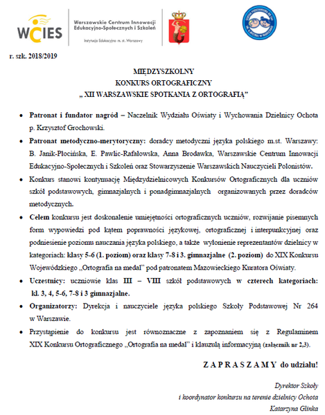 02 lutego 2019 Aktualności MIĘDZYSZKOLNY KONKURS ORTOGRAFICZNY „XII WARSZAWSKIE... Informacje dotyczące przebiegu konkursu Czytaj więcej